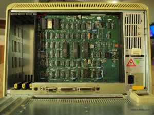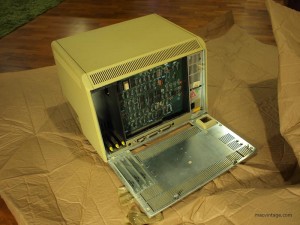 Near the top of the rear access panel are two metal knobs to access the innards of the Apple Lisa. There are three expansion slots on the left but none are installed for this particular machine. Interestingly, there is a port for video out which is the left rectangular connector.